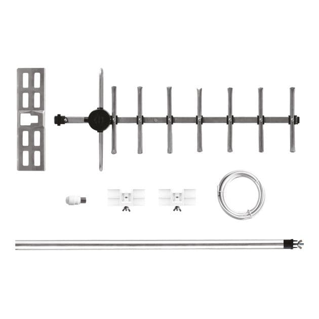 Material: Aluminium Product weight: 0.630kg Product dimensions: Height (250mm), Width (585mm), Depth (71mm) Receives all available digital terrestrial TV signals Designed and tested for outdoor use High quality, durable and robust construction Designed and manufactured in the UK 1 year guarantee Frequency Range:Wideband for UHF TV Compatibility:SD, HD, 3D and 4K TV Elements:9 Signal Strength:strong Forward Gain:5.25dB Front to Back Ratio:20dB Cable Length:5m Boom Specification:15mm Aluminium: Aerial Length:55cm Mast Adaptor Compatibility:Fits 1î mast diameter Mast Specification:1î mast diameter ñ Aluminium Mast Length:54cm